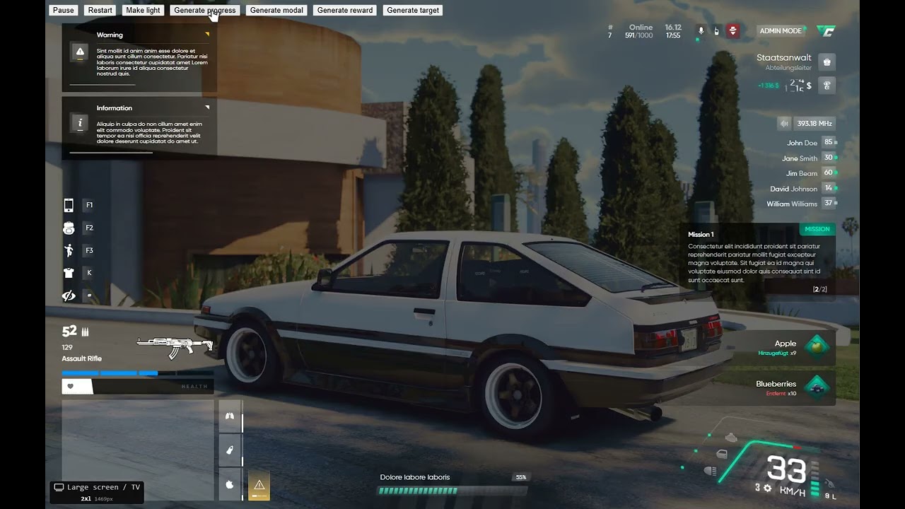- HTML как основа: Весь HUD работает на HTML, включая обработку кликов и других пользовательских событий.
