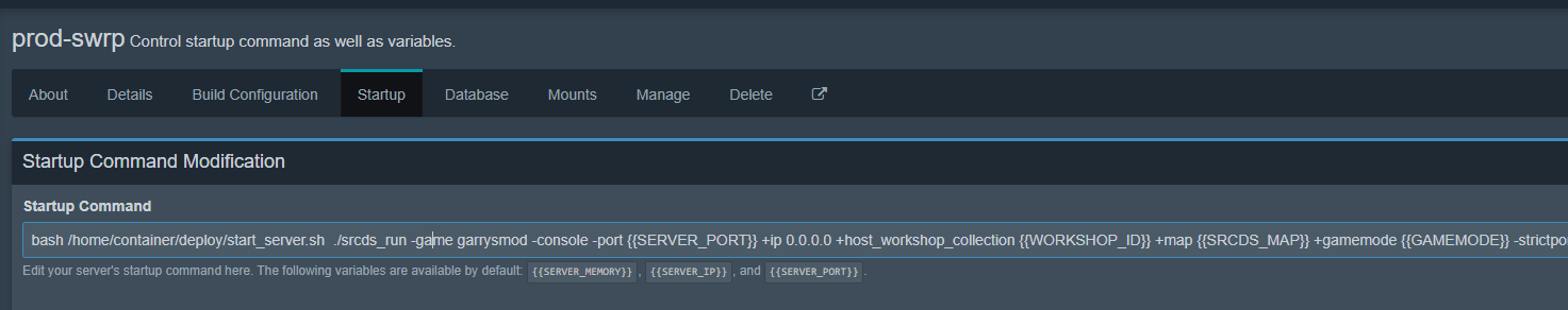 Открываем снова админ панель прод сервера и раздел startup. Вставляем В САМОЕ НАЧАЛО запуск нашего sh файла: bash /home/container/deploy/start_server.sh