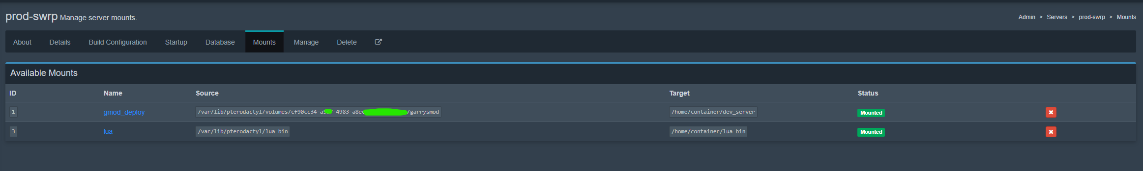 После как создали маунты открываем первый gmod_deploy (тыкаем просто на его название), справа будут Eggs и Nodes. В Eggs указываем Garrys mod, в Nodes - ноду где ваш прод и дев. Повторяем тоже самое для маунта lua.