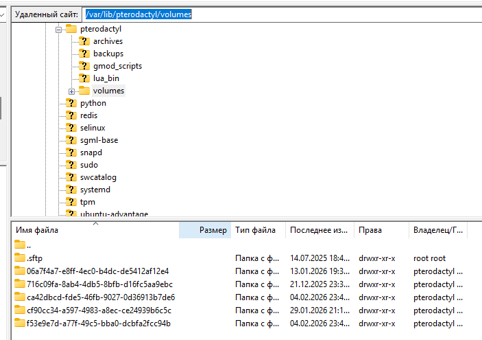 Далее открываем Filezilla или другой клиент, идём по пути /var/lib/pterodactyl/volumes